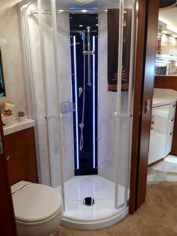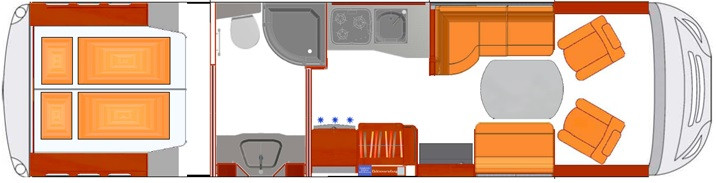 - Sliding doors in opposite directions between bathroom and rear bed