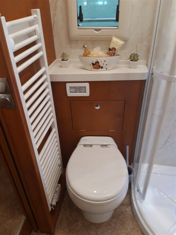- Ceramic fixed tank toilet (230 l approximately)