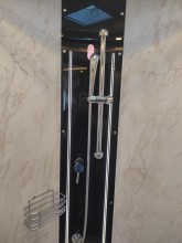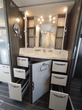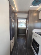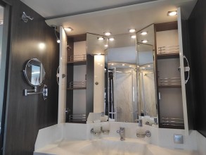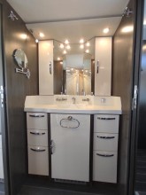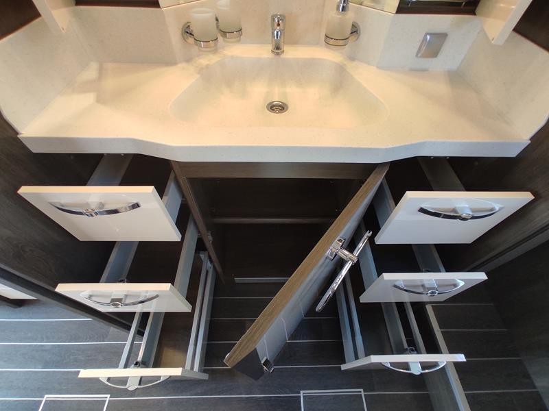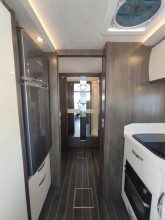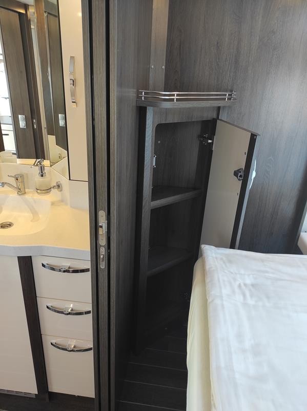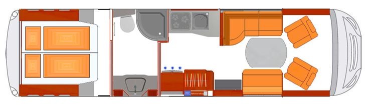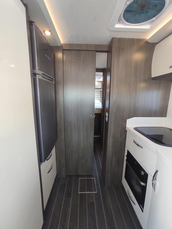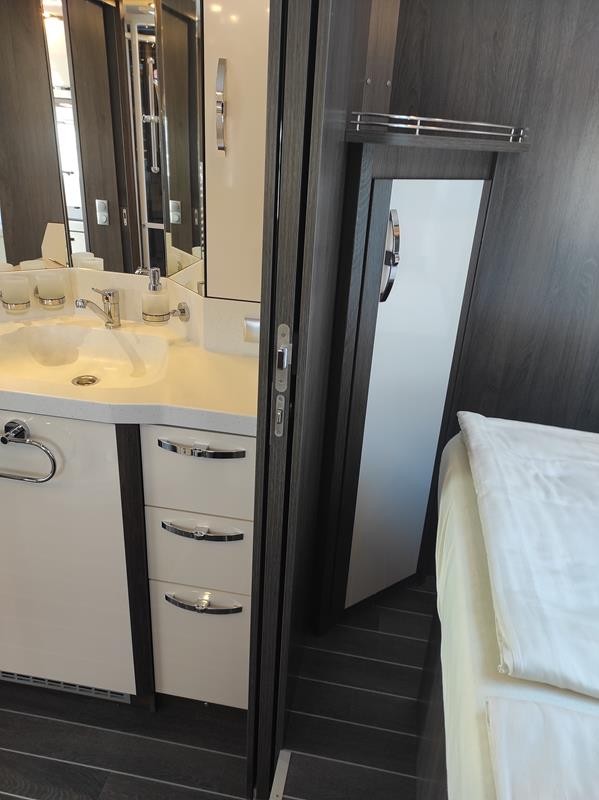 - Sliding doors in opposite directions between bathroom and rear bed.