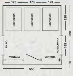 MEDIDAS: 5,50 X 5,20 m X altura 2,36/1,95 m. 3 Habitaciones. 6 plazas.