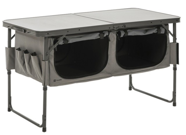El amplio mueble de almacenaje Toledo cuenta con dos compartimentos de almacenamiento para su equipo de campamento y ropa. Puede montar fácilmente la unidad de almacenamiento usted mismo. Despliegue la unidad, inserte los estantes incluidos con una capacidad de carga de 5 kg y ajuste las patas según sea necesario. La amplia unidad de almacenamiento es ideal para usar en combinación con la cocina Toledo. Una gran ventaja de esta unidad de almacenamiento es su apertura delantera y trasera. Esto le permite acceder a sus cosas en cualquier lugar y en cualquier momento, sin importar dónde se encuentre la unidad.