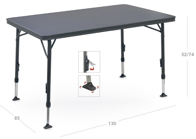 Mesa con tablero ligero color grafito resistente a las altas temperaturas y humedad.
