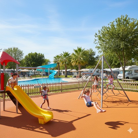 - Piscinas y toboganes: Muchos campings están diseñados pensando en los más pequeños, con piscinas espectaculares, parques acuáticos y zonas de juegos.
