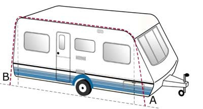 Primero nivele su caravana y fije la altura deseada. Con la caravana sobre una superficie plana, mida el contorno de la guía más su prolongación hasta el suelo por ambos lados, siguiendo la línea roja, como en el siguiente gráfico. Con la medida de A hasta B, obtendrá el perímetro de su caravana.Como puede observar en la imagen de más abajo.