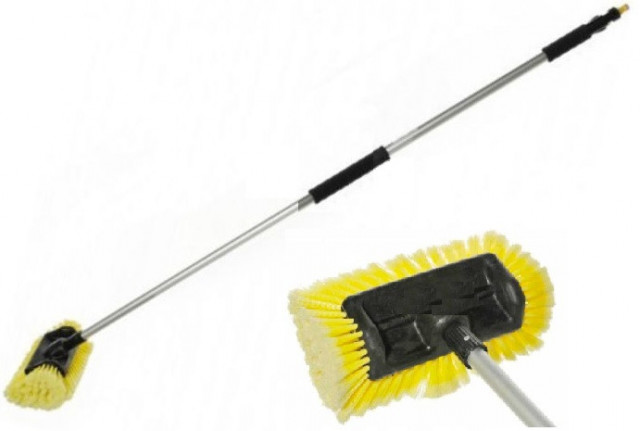 Las cerdas del cepillo llegan hasta el lateral y por lo tanto limpia las esquinas con más fácil. El ancho del cepillo es de aproximadamente 26cm. La varilla de aluminio es ajustable de 120 a180 cm. El cepillo tiene una conexión para manguera de agua.