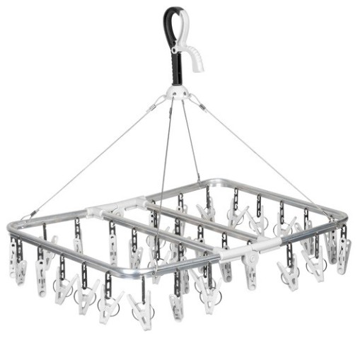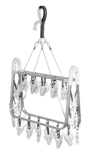 Tendedero plegable, las 32 pinzas ofrecen mucho espacio para su ropa. El gran gancho de plástico permite colgarlo. Marco de aluminio y pinzas de plástico azul claro.