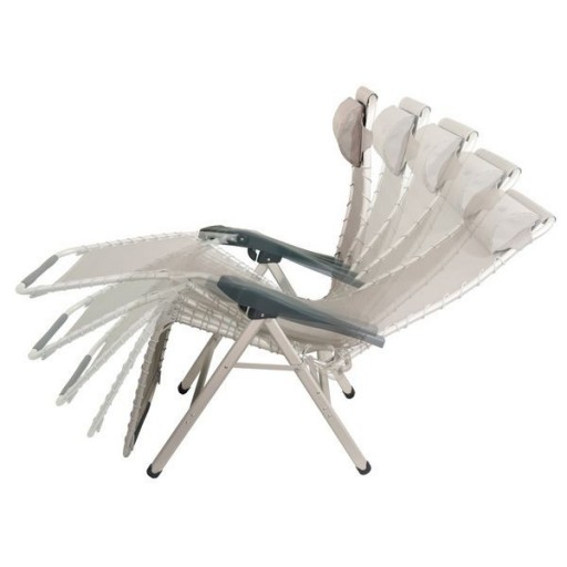 Tumbona Gran Relax elástica fabricada en aluminio reforzado. Respaldo y reposapiés reclinables en infinitas posiciones bloqueables mediante un práctico freno.