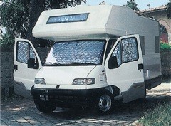 Juego de protectores térmicos a instalar en la parte interior de la cabina de la autocaravana, compuestos de tres piezas, una para el cristal delantero y dos para los cristales de cada una de las puertas.