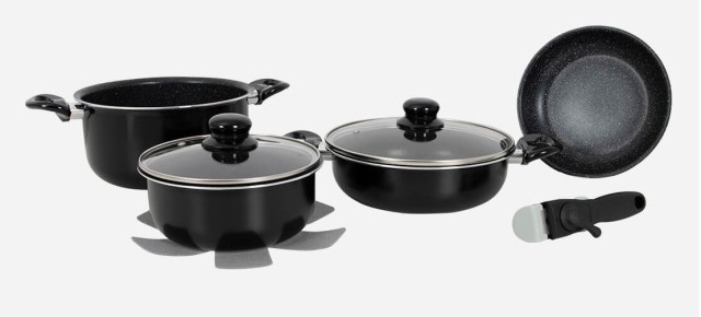 Juego de sartenes negras de 7 piezas. Muy adecuado para placas de inducción. Ideal para caravanas, autocaravanas y también para el hogar. Con resistente revestimiento antiadherente de 3 capas.