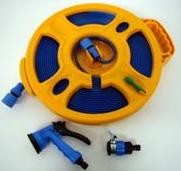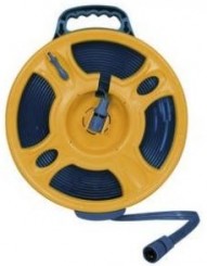 Enrollador de manguera plana antitorsión de tres secciones. Puede usarse enrollada. El tambor interior rueda fácilmente. Con asa para la rotación plegable y pistola multi-chorros.